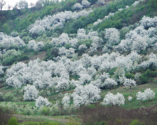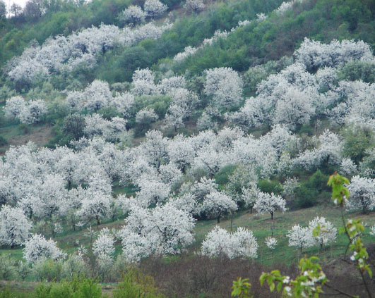 Oricum, eu zic ca a meritat sa avem intr-o parte radacinile copacilor iesind dintr-un deal abrupt iar pe partea cealalta rapa care se deschidea amenintatoare, doar pentru a ajunge in varful lumii si a privii spectacolul ciresilor. Va arat si voua o parte din frumusetea lor salbatica. Tot ce e alb sunt ciresi.