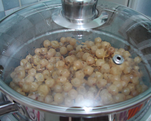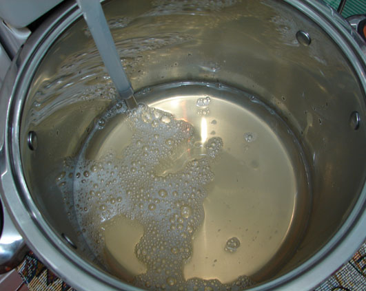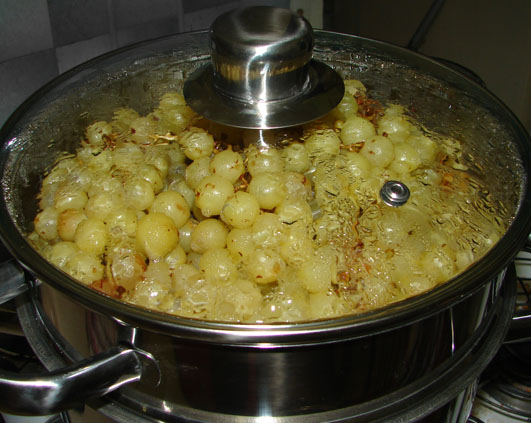 Prima data am vazut-o aici si mi-a starnit curiozitatea. Am gasit-o de cumparat pe un site si vinerea trecuta am primit-o. Fiind prea cald nu am indraznit sa-i incerc puterile, dar azi nu m-am mai putut rabda si i-am dat de lucru. Pe scurt s-ar numi distilator, nu va ganditi la tuica :). Pe lung se cheama “oala pentru extras suc din fructe si legume la aburi”. Avantajul e ca sucul din fructe astfel obtinut are nevoie de un adaos infim de zahar pentru a se pastra in camara peste iarna, comparativ cu clasicele siropuri faute in casa. Cantitatea variaza de la deloc la 300-400 gr de zahar pentru 5 kg de fructe, depinzand de felul fructelor.