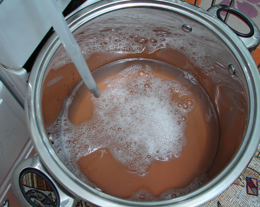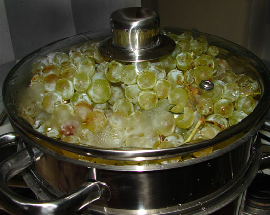 Sunt de fapt 3 oale. In partea de jos se pune apa care fierbe si trece sub forma de abur prin cea din mijloc la cea de sus care e ca o sita si in care se pun fructele. Aburii scot sucul din fructe care se scurge in oala din mijloc si apoi printr-un furtun se pune in sticle sterilizate. Eu l-am lasat de data asta sa curga intr-o oala. Era de test, nu de pus pe iarna.