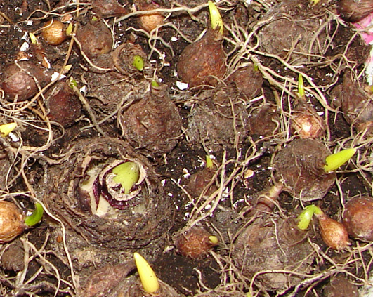 Mi-am facut brusc timp si am luat repede putinul pamant ce-l mai aveam ramas, l-am pus intr-un castron si m-am apucat sa-mi plantez bulbisorii. Doamne da multi mai erau, nu stiu cum oi fi avut rabdare azi vara de i-am ales pe toti, unii mici cat bobul de grau, de abia ii tineam intre degete, insa tot incoltiti.
