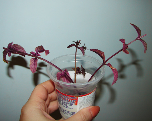 Dintre toate tipurile de menta primite, planta mentei cu aroma de ciocolata era cea mai mare. Din aceasta cauza am gasit si o crenguta rupta. Cateva frunzulite care erau mai mari si un pic de tulpina le-am transformat rapid intr-un ceai aromat, iar restul crengutei l-am rupt in trei si l-am pus in apa. Citisem undeva pe net ca menta prinde radacini si in apa asa ca le-am pus intr-un paharel cu putina apa si le-am gasit un loc pe un raft in bucatarie.
