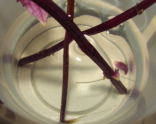 Dimineata, aveam ceva de cautat si a trebuit sa mut putin paharelul. Aruncand un ochi in apa vad ca unul din firele de menta de ciocolata are deja radacini.