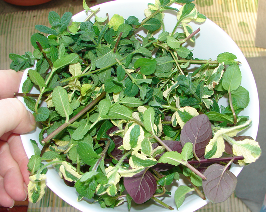 Semne serioase ca sezonul a inceput pe deplin sunt din toate partile iar eu am incercat sa tin pasul cu ele. Am cules menta ca se lungise in toate directiile si m-am ales cu un castronel de mix de menta 🙂