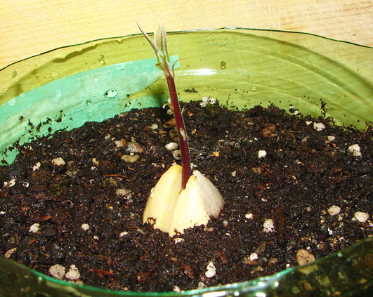 A facut radacini puternice si nu mai avea rost sa-l tin in apa. Asa ca i-am pregatit o sticla mare de 5 l de apa careia i-am taiat parte de sus, i-am facut gaurele de scurgere la baza, am umplut-o cu pamant amestecat cu nisip si am plantat samburele.