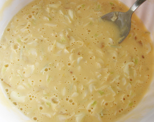 Se face clasicul aluat de clatite (faina, oua, lapte si zahar) in care se adauga flori de salcam.