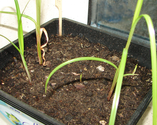 Alta planta care mi-a pus rabdarea la incercare este migdala de pamant. Am pus 7 seminte prin martie, una a rasarit relativ repede, apoi nimic. Mi-am zis ca restul nu vor mai aparea, fiind oricum destul de pricajite. Insa la fel, de cand a dat caldura au mai aparut inca doua fire, iar ieri am mai observat inca doua varfuri mici, asa ca poate totusi, vor iesi si ultimele doua 🙂