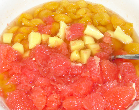 Apoi am luat doua greph roz pe care le-am curatat de pielite si a rezultat 600 gr fruct pe care le-am adaugat in amestecul de corocduse. Apoi am taiat bucatele 50 gr ghimbir pe care le-am pus peste, am amestecat bine si le-am pus pe foc sa dea un clocot