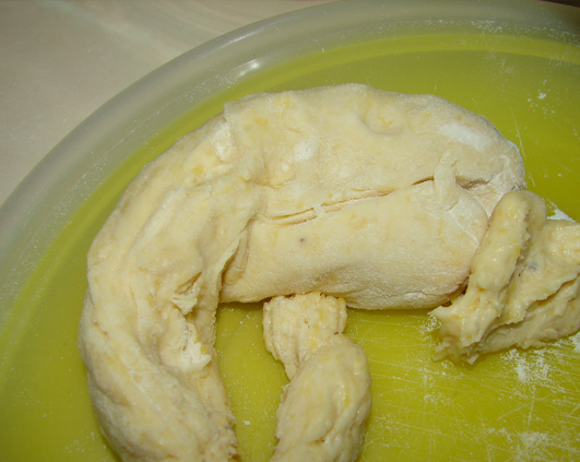 L-am impartit in bucatele pe care le-am facut apoi sul gros cam cat degetul mare, cu ajutorul copilului care a fost foarte incantata de manuirea aluatului 🙂 Apoi l-am taiat bucatele mici