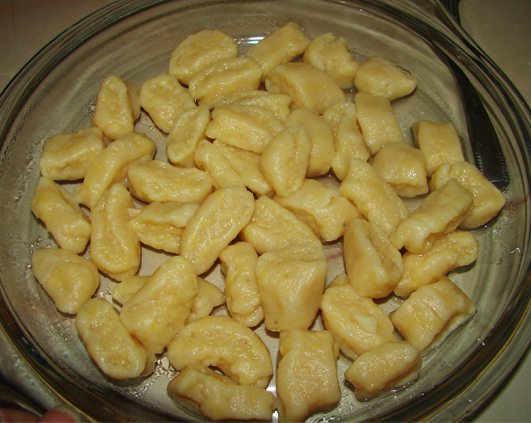 Am avut un dovlecel copt pastrat pentru a lua semintele. Si dupa ce am scos semintele m-am gandit ca as putea sa-l folosesc, de ce sa-l arunc. Asa ca l-am copt in cuptor ca pe un dovleac de copt. Dupa ce s-a racit am scos miezul, l-am amestecat cu doua oua, un pumn de cas razalit, sare, piper si faina cat cuprinde sa iasa un aluat nu foarte tare dar nici sa se lipeasca de maini. Aluatul l-am lasat pana a doua zi in frigider, nu mai aveam chef sa fac aburi in casa la 10 seara 🙂 Astfel ca aseara am pregatit “squash gnocchi”. Daca aveti idee cum s-ar putea numi pe la noi va rog sa-mi spuneti 🙂