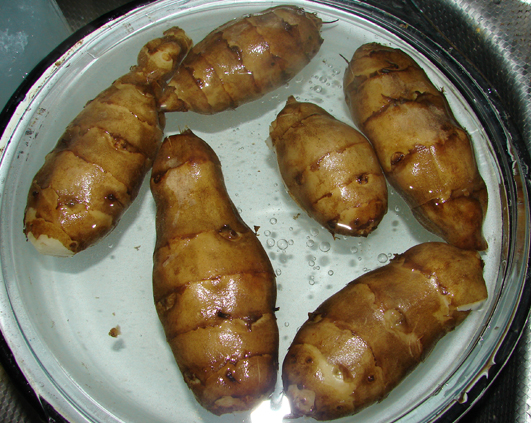 Am cumparat zilele trecute niste topinambur. Nu mai mancasem pana acum, sau am mancat cand am fost prea mica ca sa-mi amintesc. Asa ca m-am bucurat ca am gasit de cumparat. Am luat un kg, de pofta si ca sa vad cum e, pretul fiind prea mare pentru o leguma care in mod normal creste pe orice sant. Recunosc ca tuberculii erau destul de marisori, deci se vedea ca e de cultura si nu de sant, dar oricum. Doi sau trei i-am pus intr-un ghiveci cu pamant, restul i-am spalat bine si i-am fiert asa in coaja, ca si cartofii.