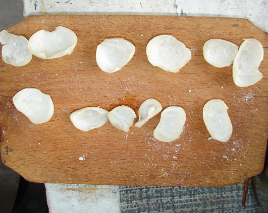 Nu mai stiu cand si de unde a aparut obiceiul asta la noi in casa, insa de multi ani mama face acest calendar in fiecare an. In noaptea de anul nou, cat mai aproape de miezul noptii dar dupa acesta, se taie o ceapa si se separa fiecare camasa apoi in fiecare caus se pune sare. Se lasa cam 12 ore apoi se “citeste” calendarul. Eu inca nu prea is lamurita care e semnificatia plusurilor din calendar, insa stiu ca acest calendar prevesteste cat de ploioase sau secetoase vor fi lunile anului in functie de cata apa se formeaza in fiecare caus.