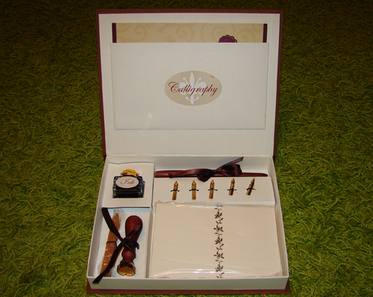 Asa ca mi-am cumparat un set de caligrafie. Sper sa fie pe atat de folositor pe cat e de aratos 🙂 Are multe: un toc din lemn, 5 penite de diferite grosimi, o sticluta cu cerneala albastra, o stampila cu motiv de crin, un baton de ceara pentru sigiliu, 10 felicitari si 10 plicuri. Toate ambalate frumos intr-o cutiuta de carton.