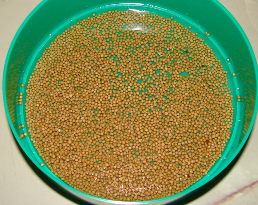 Prima incercare cu germinatorul este cu seminte de mustar. Am pus boabele la inmuiat cateva ore in tavita fara gauri