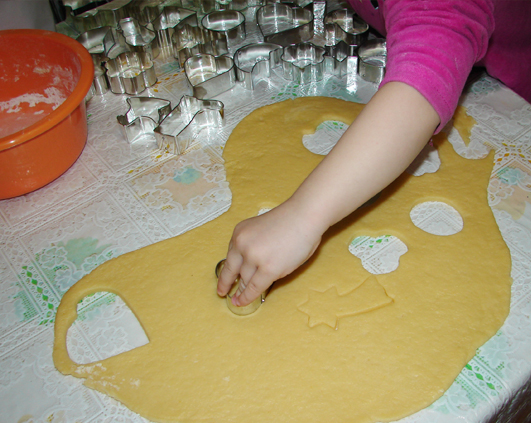 Si cum pitica mea a fost cea pentru care am castigat acest set, a vrut neaparat sa-l punem la incercare. Iar daca afara ninge, putem zice ca vremea se aseamana cu cea care ar fi trebuit sa o avem de Craciun, asa ca am facut fursecuri cu tema de sarbatori.