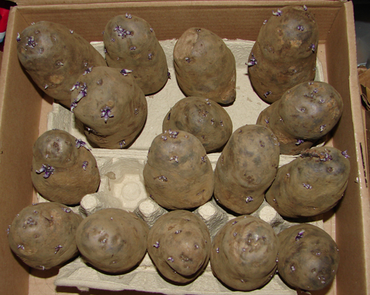 Se zice ca ai recolte mai bune la cartofi daca ii pui la incoltit inainte sa-i plantezi. Asa ca am scos cartofii albastri din cutie si i-am asezat frumusel in cartoane de la oua. Deja au si inceput sa-si arate coltisorii 🙂