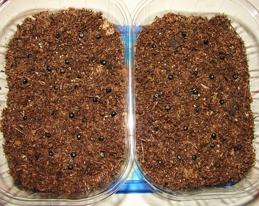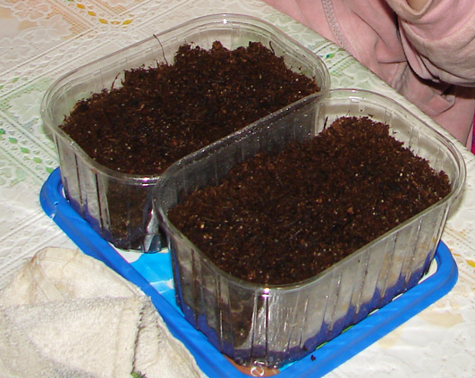 Am folosit niste cutiute ramase de la niste capsuni, pe care le-am umplut cu pamant, apoi am imprastiat cat mai egal semintele pe suprafata lui.