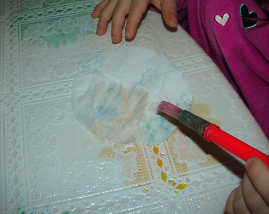 Folosind o pensula groasa intindeti solutia de faina si apa pe discurile de hartie. Cine are copil in doatare se poate folosi de el 🙂