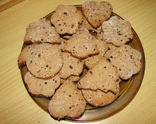 Am pus un pumn de miez de nuca si o jumatate de ciocolata neagra rupta in bucati in robot si am tocat pana s-a sfarmat totul. Am adaugat un pumn de seminte de susan, 3 oua, un gat de ulei de dovleac, un praf de scortisoara, faina cam dupa ureche cat sa iasa un aluat bun de intins si taiat cu forma, cam 8-10 linguri nu foarte pline si niste praf de copt. Am mixat pana s-a facut un guguloi pe care l-am intins si decupat in forme de fursecuri. Am copt la foc potrivit vreo 20-25 minute. Au iesit doua tavi mari. Nu am folosit zahar deloc.
