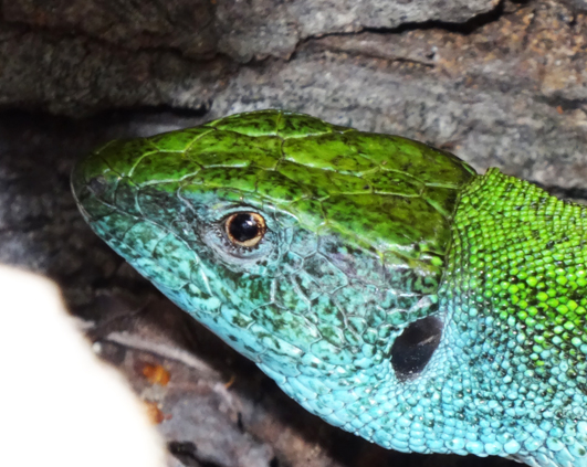 Livada mamei e un loc plin de viata. Pasari vesele, arici sfiosi, broaste galagioase, toate isi gasesc locul acolo. La plimbarea de zilele trecute am observat un nou locatar. Colorat si dragalas. Putin sfios, dar curios nevoie mare, a iesit din ascunzatoare sa vada cine ii tulbura linistea, apoi s-a asezat tacticos la soare sa se incalzeasca.