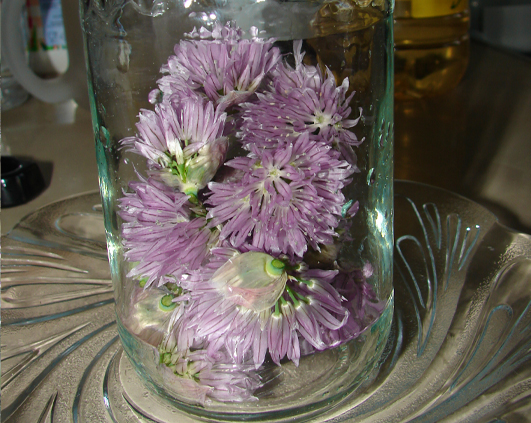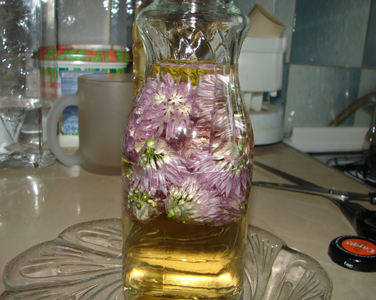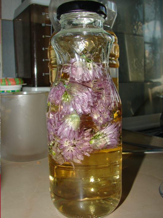 Peste ele am adaugat otet din vin alb pana aproape s-a umplut sticla, lasand loc si pentru florile viitoare.