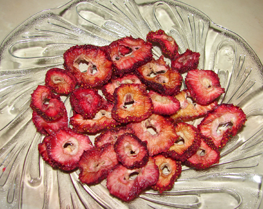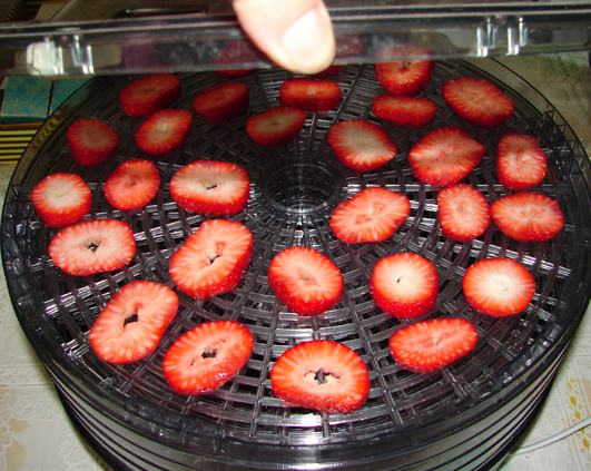 Am incercat o tura de capsuni la deshidrator sa vad cum ies. Avand in vedere ca de gemuri si compoturi ne-am cam saturat, incerc sa gasesc cea mai buna solutie de a stoca fructele peste iarna, iar deshidratarea lor mi se pare cea mai buna solutie. Ocupa putin spatiu, nu folosesc cantitati imense de zahar, nu se strica, pot fi apoi folosite la ceai, in combinatie cu cereale cu lapte sau iaurt, in prajituri, pot fi facute chiar compot sau gem instant cand e nevoie, consumate ca atare cand vreti ceva dulce pentru ca prin deshidratare zaharul din fruct se concentreaza. Concluzia mea, cea mai buna varianta pentru mine de a stoca fructele e deshidratarea.