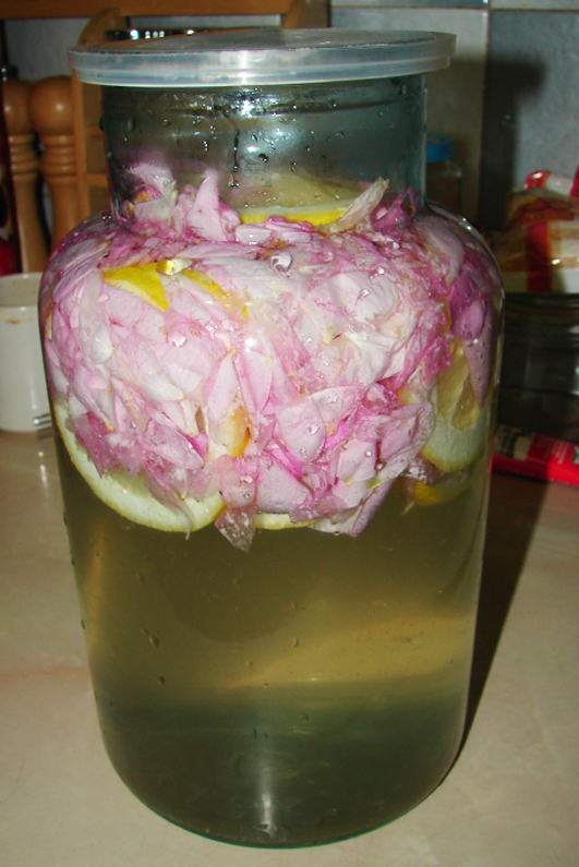 Am mai gasit niste trandafiri de dulceata si mi-am zis sa incerc o reteta mai putin cunoscuta. E ca o socata, dar facuta cu petale de trandafiri. Am luat un borcan de 3 litrii in care am pus o cana de zahar, o lamaie felii si petalele de la vreo 5 trandafiri de dulceata. Apoi am umplut borcanul cu apa calda, am amestecat pana s-a topit zaharul, am pus un capac deasupra si l-am lasat pe masa in bucatarie.