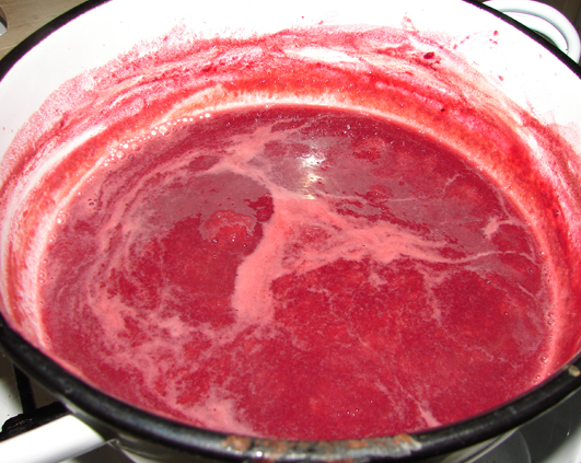 Pe cand a scazut siropul cam o treime, am adaugat o cana de zahar, doar cat sa nu fie acreala curata, si l-am mai fiert putin, obtinand un sos gros. L-am pus la borcan si apoi am pus borcanele la frigider de siguranta.
