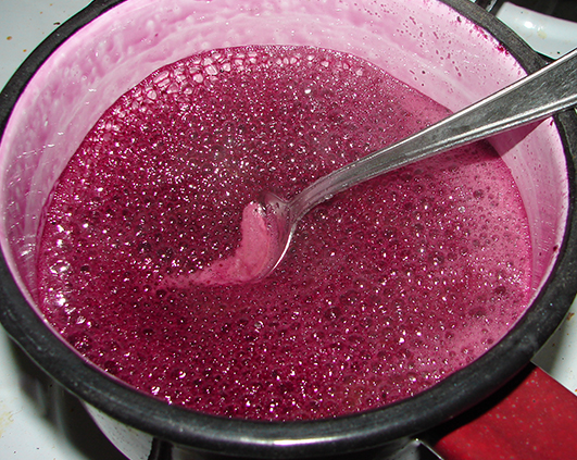 Le-am curatat de pe palarii, le-am clatit usor apoi le-am pus la fiert cu niste apa. Le-am lasat sa clocoteasca apoi le-am dat prin sita. Sucul rezultat l-am amestecat cu niste zahar si l-am pus din nou la fiert.