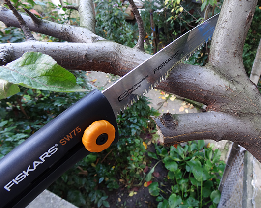 Insa a venit randul crengilor mai groase unde a trebuit sa folosesc un fierastrau de mana. Am gasit unul ce-l avea tata, insa dupa ce m-am chinuit cu vreo doua crengi de a curs apa pe mine am renuntat si am lasat copacul ciuntit. Asa ca mi-am zis, daca foarfeca a facut asa treaba buna, oare cum ar fi un fierastrau de la Fiskars? Am cumparat unul si in weekendul ce a trecut am mers sa termin treaba. Cred ca stiti deja, treaba a facut-o fierastraul nu eu. Am taiat crengile groase cat ai zice peste, fara niciun efort. Taieturi curate, precise si usor de realizat. Iata diferenta. Crengile taiate cu fierastraul cel vechi arata asa