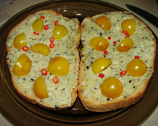 Niste paine prajita, asezonata cu ultimele rosioare si niste ardei iute si gata micul dejun cu aroma de vara.
