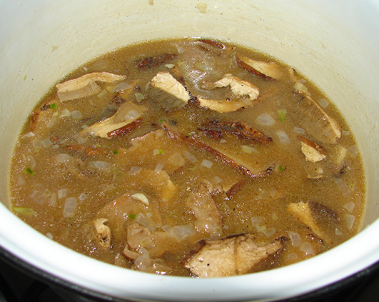 Dupa ce s-au aurit putin, adaugam hribii cu tot cu apa in care s-au inmuiat si lasam sa fiarba totul pana incepe sa scada lichidul.