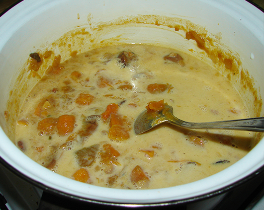 Mai fierbem pana se zdrobeste putin dovleacul, apoi pasam totul cu blenderul pana se obtine crema.