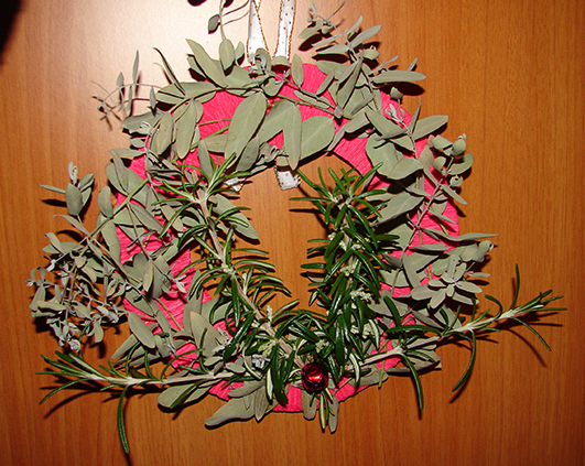 Cu materie prima din dotare, adica din balcon, am inceput sa decorez discul. Am folosit crengute de rozmarin si eucalipt, moment in care am realizat ca a inflorit rozmarinul 🙂