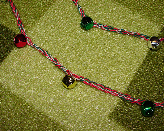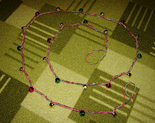 Luasem mai pe la inceputul lunii niste zurgalai mici in ideea sa fac ceva decoratiune cu ei, insa pana aseara am tot cautat idei si n-am gasit nimic. Apoi cantand de zor cu copilul cantece de craciun mi-a venit ideea sa fac o ghirlanda de zurgalai. Asa ca am luat ate asortate si am inceput a croseta zurgalai pe snur. Iata ce a iesit