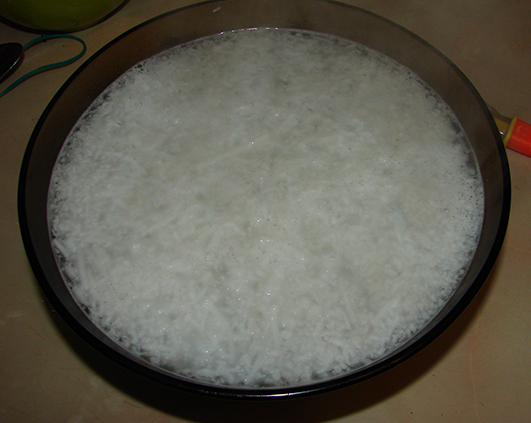 Am acoperit castronul si am lasat sa stea asa cam o jumatate de ora, apoi am strecurat laptele. Am baut un pahar de lapte cald iar restul l-am pus la pastrare. Are gust de orez cu lapte diluat cu apa si cu aroma de cocos 🙂