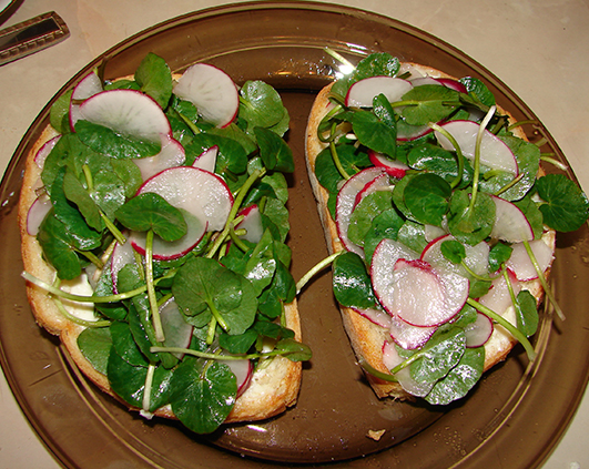 Am vrut sa culeg de-o supa insa erau atat de mici ca mi-ar fi luat o vesnicie, asa ca m-am rezumat la cules doar pentru o salata. Si pentru putina culoare am cumparat niste ridichi pe care le-am feliat subtire si le-am amestecat cu frunzele crocante.