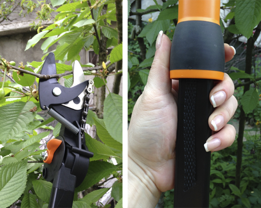 Usor de manevrat, se potriveste pe creanga ce urmeaza a fi scurtata si tragand usor dar ferm de snur ai taiat perfect. E atat de usoara ca nici nu-ti dai seama, parca ai tine un bat in mana. Cu vechea foarfeca a tatei ma chinuiam de ameteam, si grea, si taia prost, mai mult rupea crengile decat sa le taie.