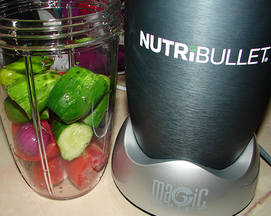 Dupa ce am curatat paharul si cutitul (se spala foarte usor), vine sotul meu cu o idee. Zice: daca chiar toaca tot, iar mie imi place salata de rosii cu castraveti si ceapa, ce-ar iesii daca le-ai baga in Nutribullet. Hai sa vedem. O rosie, 3 castraveciori si o ceapa mica.