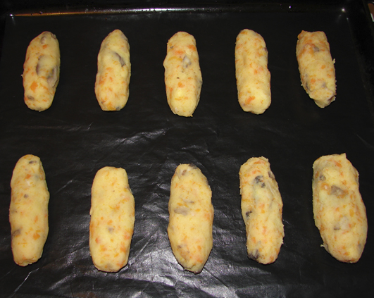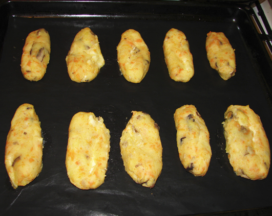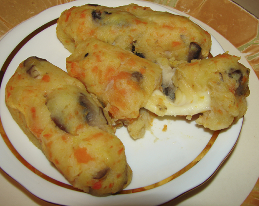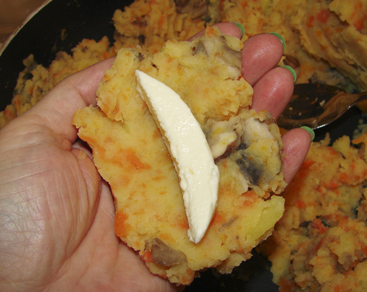 Cand amestecul de cartofi s-a racit destul cat sa poata fi manevrat, am luat cate o lingura de compozitie, am facut-o placintica si am pus in mijloc cate o bucatica de mozzarella