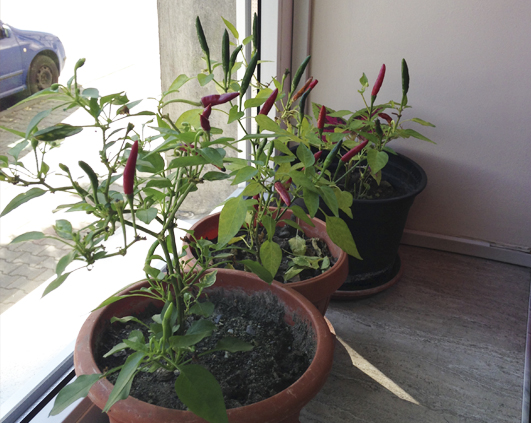 Si ca sa mai inveselim putin atmosfera, am acaparat si geamul din biroul sefului, unde am relocat niste ardei iuti din curtea mamei.