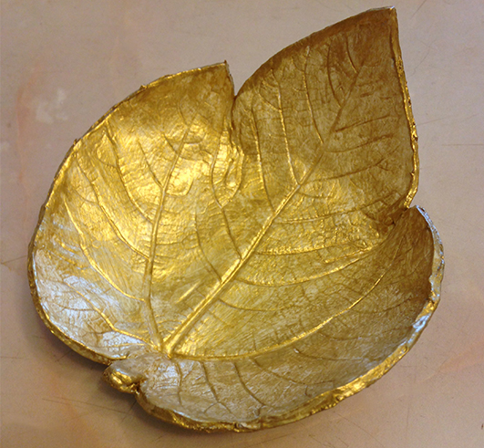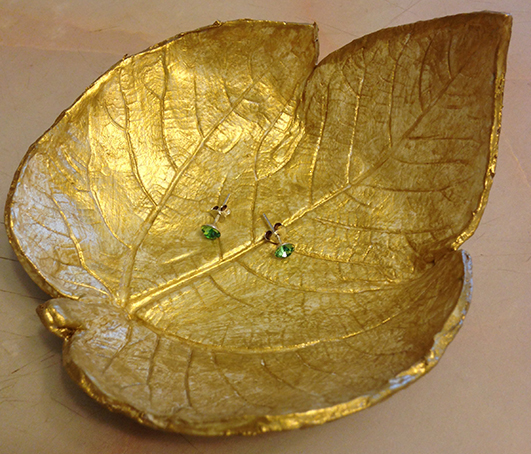 Asadar: pasta de modelaj cu uscare la aer, o frunza micuta de smochin, un castronel pe masura frunzei pentru a da forma, acrilic auriu si putina indemanare. Gata farfuria pentru bijuterii 🙂