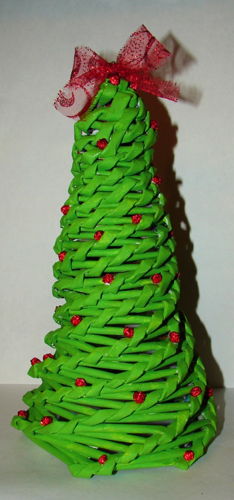 Imi place din ce in ce mai mult sa ma joc cu tuburi de hartie. Asa ca am impletit un bradut. Nu o fi el cel mai drept din lume, dar e primul 🙂 promit ca restul sa fie mai drepti.
