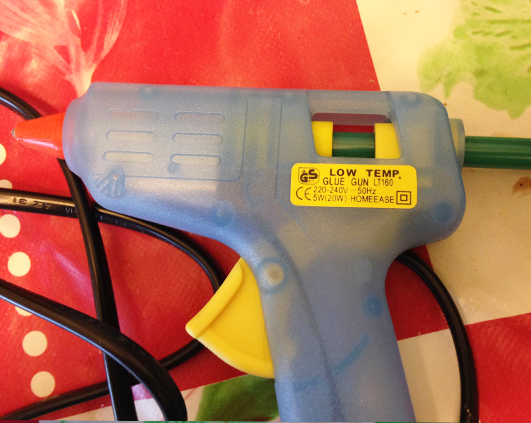 Am luat ace simple cu gamalie, un pistol de lipit la temperatura joasa si un baton de lipici verde