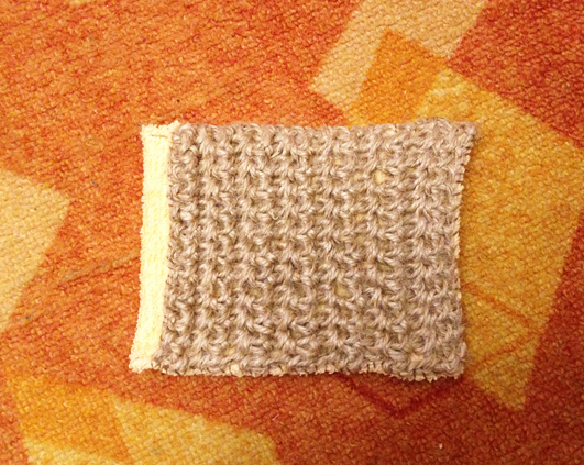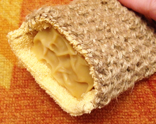 Am lasat intentionat o laterala necusuta ca sa pot pune un sapun in cazul in care vreau sa folosesc acest tip de burete ca si manusa de baie. Poate fi la fel de bine folosit ca burete de vase, in acest caz poate fi cusut pe toate partile.