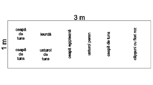 In cel de-al doilea, care e majoritar ocupat de familia cepei-usturoiului, cu o mica exceptie pe un capat unde sunt capsunii cu flori roz, in spatiul ramas gol am semanat niste seminte de usturoi peren.