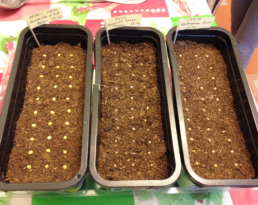 Si cum unele dintre ele cam trebuiau semanate de ceva vreme, desi inca nu e foarte tarziu, am fugit repede sa le pun in pamant. Cele care au ajuns primele in rasadnita au fost rosiile, ardeii, vinetele si pepenele galben.