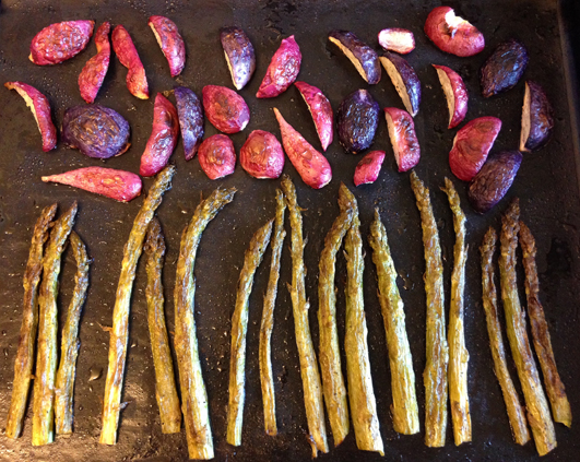 Da, ati citit bine 🙂 Am primit niste ridichi cam marisoare si nu prea imi suradea ideea de a le face salata, asa ca am scormonit netul si am gasit ca se pot coace la cuptor. Mai aveam si niste sparanghel care isi astepta randul la cuptor, asa ca le-am imprietenit si le-am bagat la copt. Le-am tavalit usor intr-un amestec de ulei de masline cu sare si piper si la cuptor cu ele.