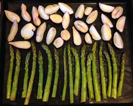 Da, ati citit bine 🙂 Am primit niste ridichi cam marisoare si nu prea imi suradea ideea de a le face salata, asa ca am scormonit netul si am gasit ca se pot coace la cuptor. Mai aveam si niste sparanghel care isi astepta randul la cuptor, asa ca le-am imprietenit si le-am bagat la copt. Le-am tavalit usor intr-un amestec de ulei de masline cu sare si piper si la cuptor cu ele.