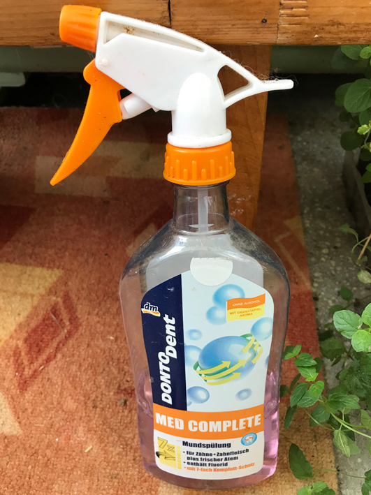 Amestec de apa de gura cu apa – 1 parte apa de gura, 3 parti apa. Se stropeste de cate ori e nevoie, la mine a fost de ajuns doar de doua ori in vara asta si n-am mai avut probleme.