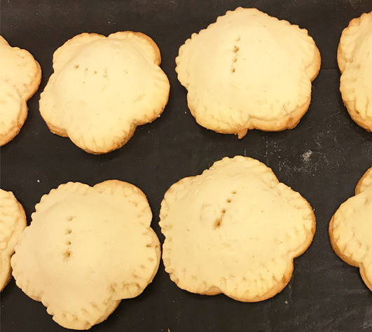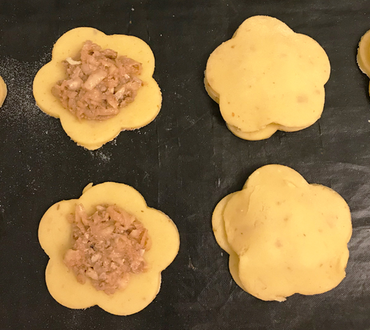 Se intinde aluatul foaie si se taie in fome de ce vreti voi, eu am ales floricele. Se pune in mijloc cate o lingurita de umplutura si apoi se acopera cu inca o forma de aluat. Se preseaza usor cu furculita pe margini sa se lipeasca cele doua bucati de aluat si se inteapa cu furculita in mijloc sa poata iesi aburul la copt.